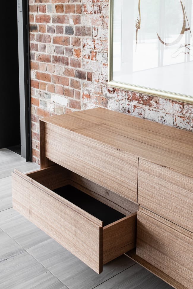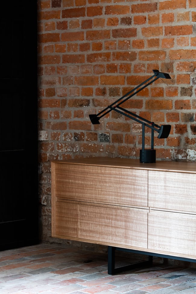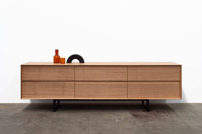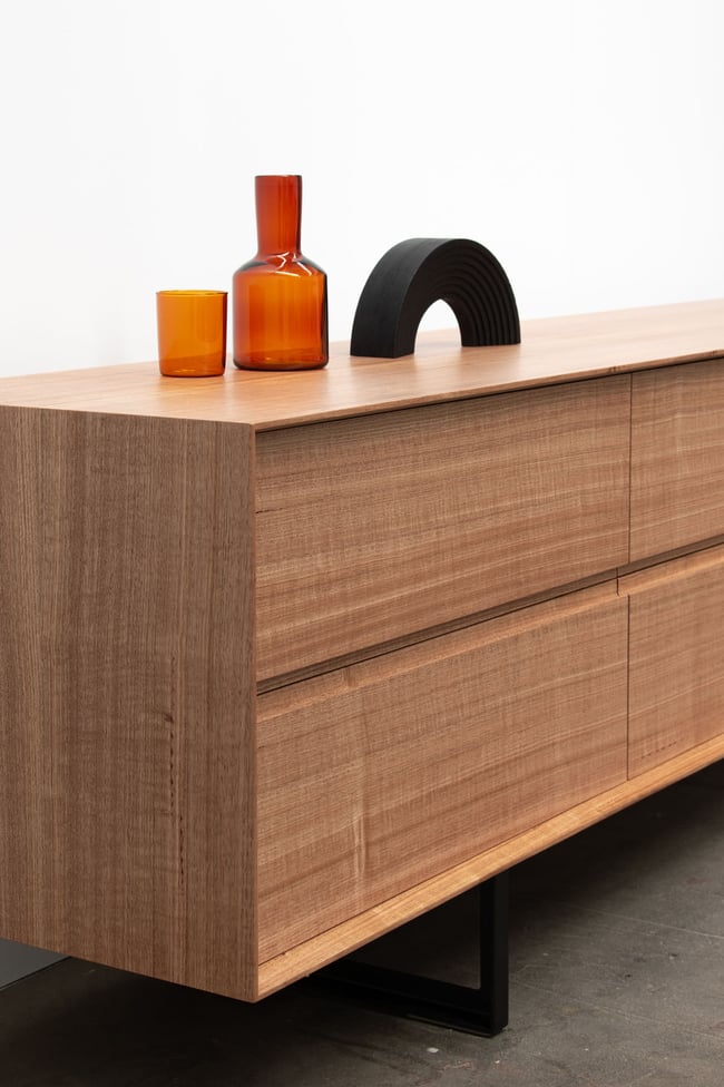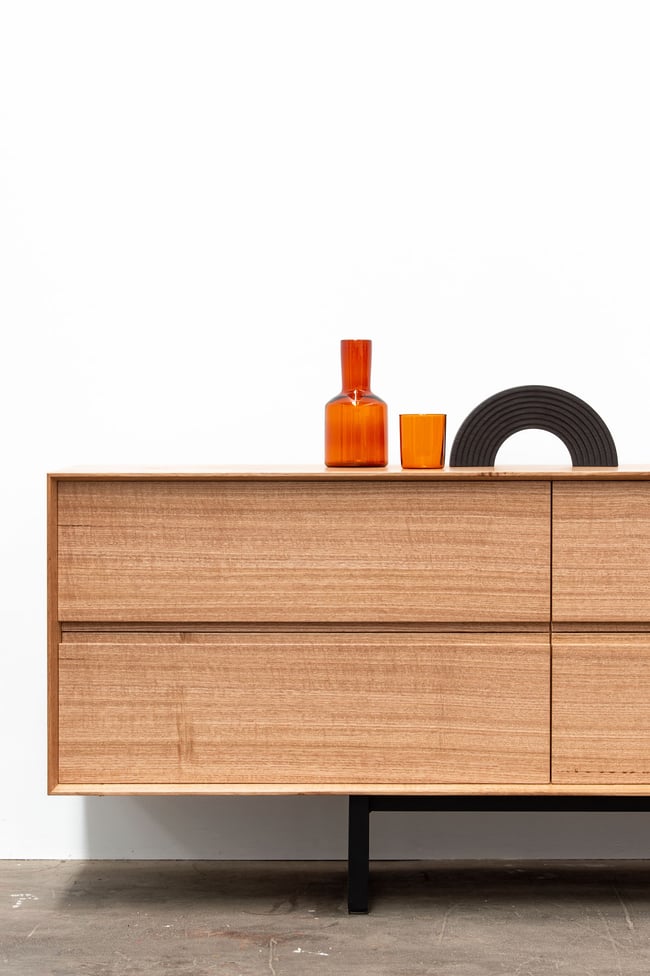 The Reid sideboard is constructed using solid Tasmanian oak and has a steel powder coated base in textured matte black.